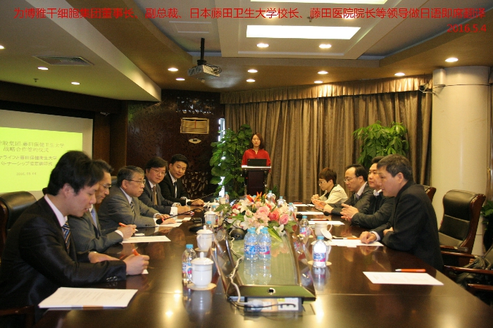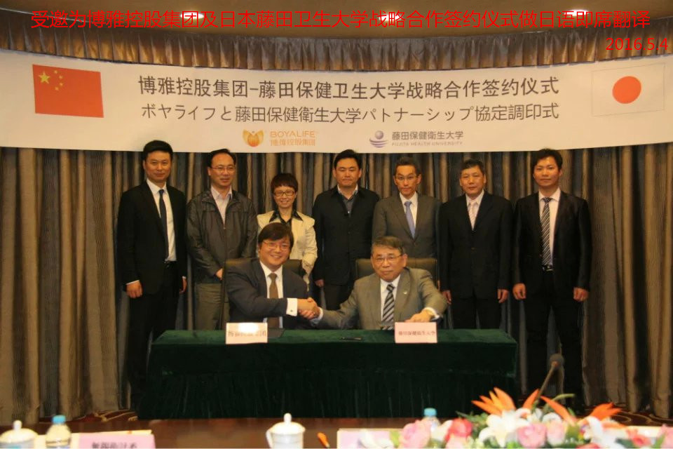 2016年5月 博雅控股集团与日本藤田保健卫生大学战略合作签约仪式;政府外事翻译(期间为无锡科技局副局长、商务局副局长、卫计委副主任、江南大学医学院院长、太湖国家旅游度假区管委会副主任、藤田保健卫生大学校长星长博士、藤田附属医院院长岩田博士等做了即席翻译。)