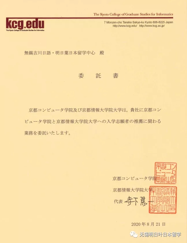 2020年8月21日,这是令所有明日叶人值得高兴的一天,经过多年的努力,(无锡日本留学咨询--明日叶)京都情报大学院大学正式向无锡明日叶日本留学中心授予赴日留学生招募委托状,这也标志着我们离梦想的步伐又跨出了很大的一步~!