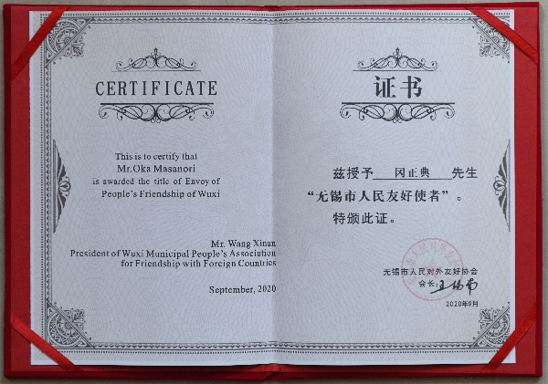2020年11月13日,这是一个值得铭记的日子,吉川-明日叶日语资深老师、日语高级顾问-冈正典老师荣获“无锡市人民友好使者”荣誉证书和水晶奖杯,(无锡日语考级班-吉川)虽然由于疫情的原因,他暂时无法回到无锡前去参加颁奖典礼,但是这足以证明无锡对于这位日本友人的长期付出所给予的认可,让我们来一起看一下这美丽的水晶奖杯和奖状: