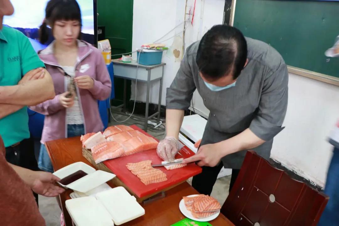 在观看完宣传视频之后,轮到我们活动的主人公上场,他就是日航饭店-日料店厨师长,由他表演三文鱼解体秀,只见蔡老师和助理上台之后,深情专注,用着十分娴熟的手法,(无锡日本留学哪家好--行知)将一条鲜活的三文鱼切成了一片一片,一块块大鱼肉令人垂帘三尺。